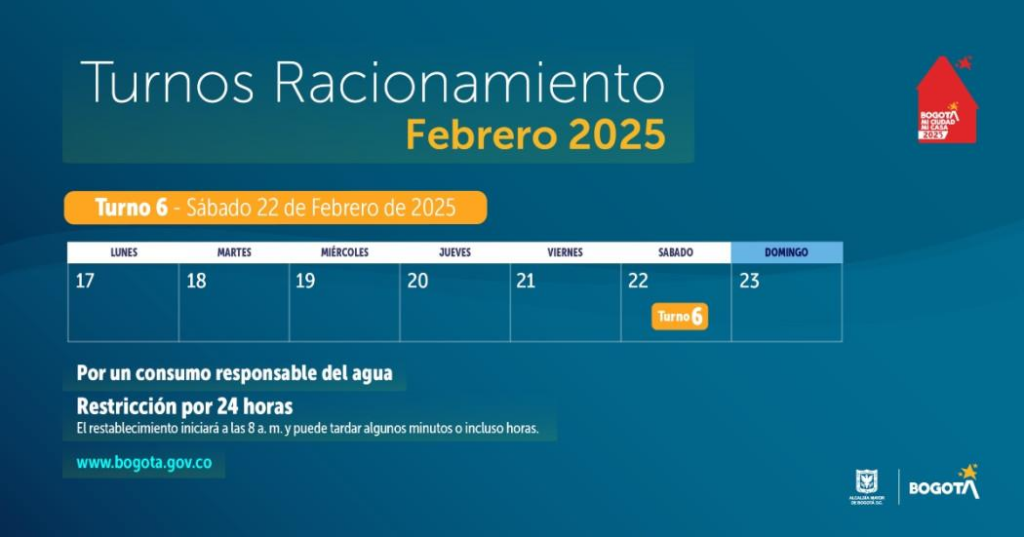 Este sábado 22 de febrero de 2025, rige el turno seis de racionamiento de agua en Bogotá y en Soacha. Las restricciones de este turno del ciclo 29 aplican en barrios de las localidades de Ciudad Bolívar, Suba, así como sectores del vecino municipio de Soacha, en los que rige esta medida. ¡Conoce todos los detalles y agéndate!