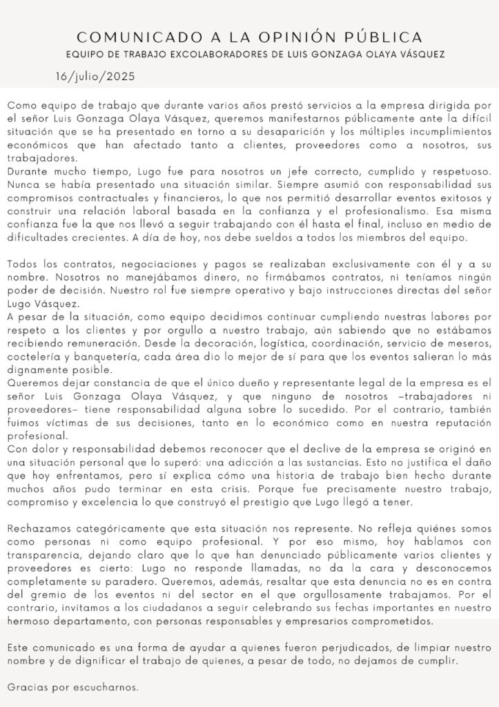 Tras la denuncia, el grupo de excolaboradores de Luis Gonzaga Olaya Vásquez emitió un comunicado en el que confirman haber sido también víctimas. Aseguran que los contratos y decisiones eran responsabilidad exclusiva del organizador. Señalan que el declive de la empresa coincidió con una crisis personal de Lugo, pero rechazan ser asociados con su comportamiento. Afirman que su labor fue siempre profesional y hacen un llamado a seguir confiando en el gremio de eventos del Eje Cafetero.
